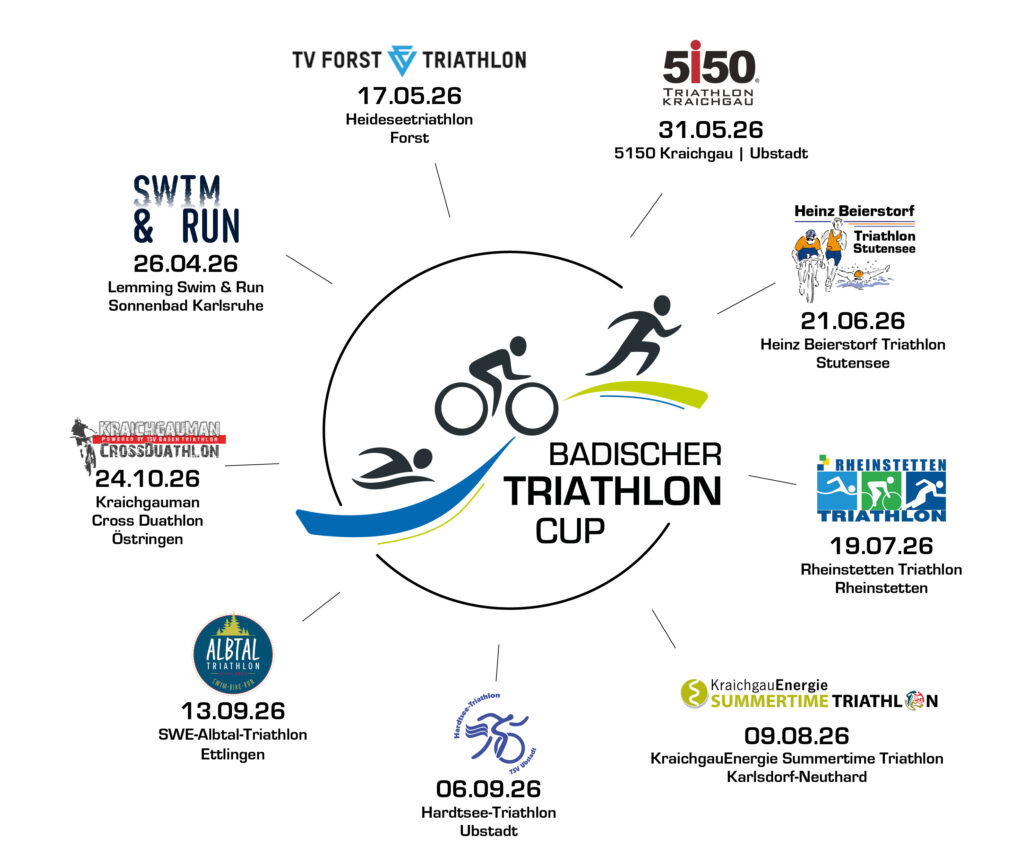 Folgende Veranstaltungen nehmen am Baden-Tri-Cup 2026 teil. Bietet die Veranstaltung mehrere Wettbewerbe an, dann zählt immer der Wettbewerb mit der längsten Strecke in die Wertung: